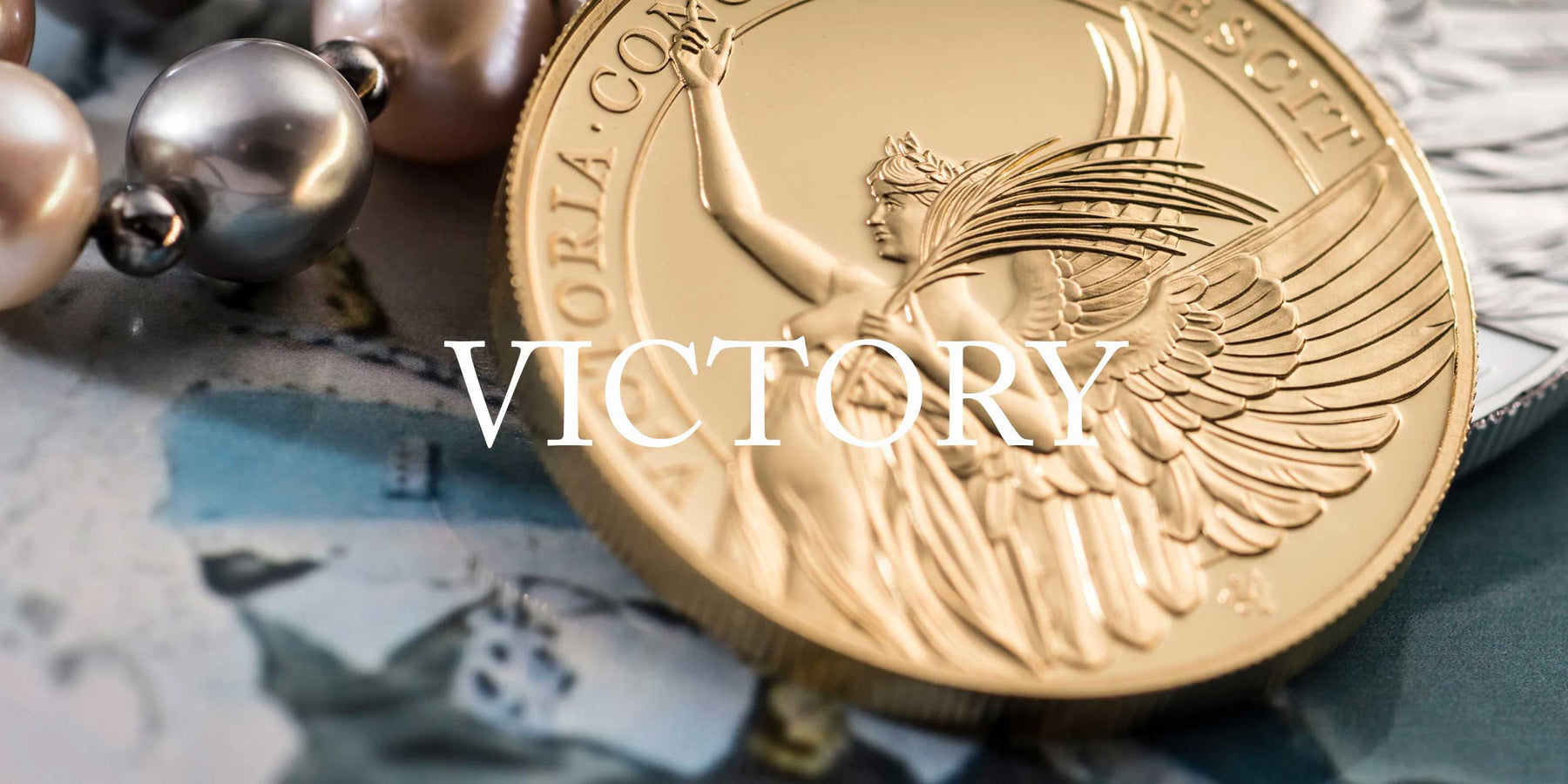 Our first coin in the series features the allegorical representation of Victory inspired from the classic and much-admired Victoria Memorial. She is depicted facing left, a victor’s palm held in her left hand, her right arm outstretched in triumph.